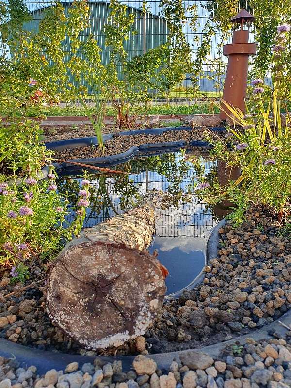 Damit der Frosch und auch Insekten problemlos aus dem Wasser gelangen können, ragen nun ein großer Ast und Zweige als kleine Ausstiegshilfen in den Teich des Glücksgartens hinein.