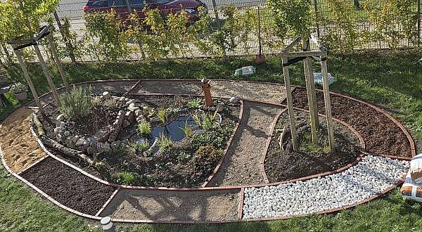 Auf einer Fläche von 91 Quadratmetern wurden im Glücksgarten bereits ein Barfußpfad, ein Kräuterbeet inklusive Sandarium für Wildbienen und ein Teich angelegt. Natürlich darf am Ufer – passend zum Namen des Hauses – ein großer Leuchtturm als Deko-Element nicht fehlen. Ein besonderes Highlight: Am Teich wurde bereits ein Frosch entdeckt.