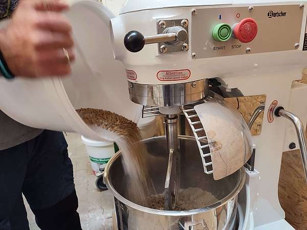 In einem großen Teigkneter, wie er sonst in Bäckereien zu finden ist, wird der Beton angemischt.