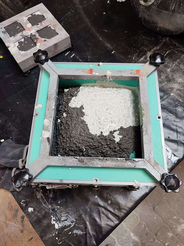 Nach und nach wird die Betonmasse in die Form eingefüllt.