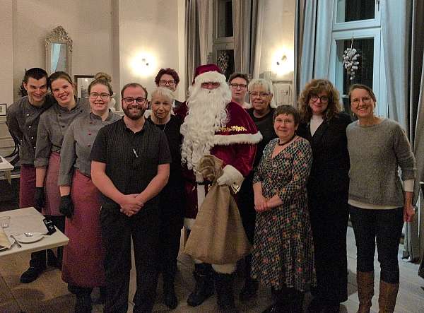 Bei Kürbiscremesuppe, Duett von der Ente mit verschiedenen Beilagen und einem Lebkuchen-Parfait an weihnachtlicher Beerengrütze kam man schnell ins Gespräch und eine festliche Stimmung erfüllte den Gastraum. Für weihnachtliche Musik mit Gesang, E-Piano, Gitarre und Percussion sorgten Stephanie Ebel, Bodo Will und Klaus Schäpe, die dem himmel + erde schon seit vielen Jahren zugetan sind. Auch eine Weihnachtsgeschichte und der Besuch des Weihnachtsmannes samt Geschenken gehörten zum Rahmenprogramm. Die Gäste genossen den Abend sichtlich.