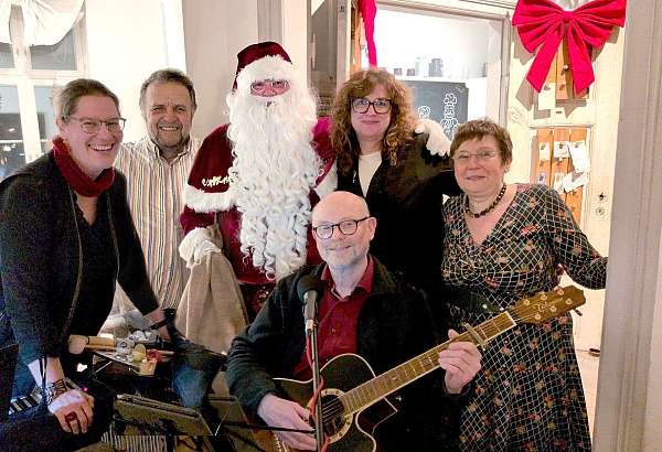 Claudia Doll (2. v. r.) organisierte bereits zum dritten Mal einen Benefizabend im himmel + erde. Unterstützt wurde sie neben vielen anderen von den Musikern Stephanie Ebel (v. li.), Klaus-Gerd Schäpe, und Bodo Will, Zahnärztin Anette Exner-Holzheidt – sowie dem Weihnachtsmann.