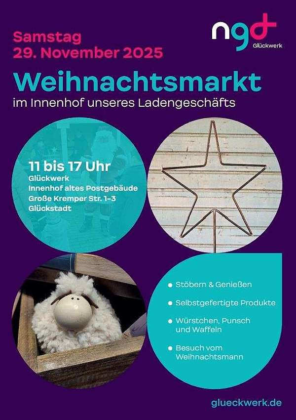 Am Samstag, 29. November 2025, findet im Innenhof des Glückwerks unser Weihnachtmarkt statt. In vorweihnachtlicher Atmosphäre erwarten Besucher*innen selbst gefertigte Produkte, Würstchen, Punsch und Waffeln. Auch der Weihnachtsmann wird zu Besuch kommen.